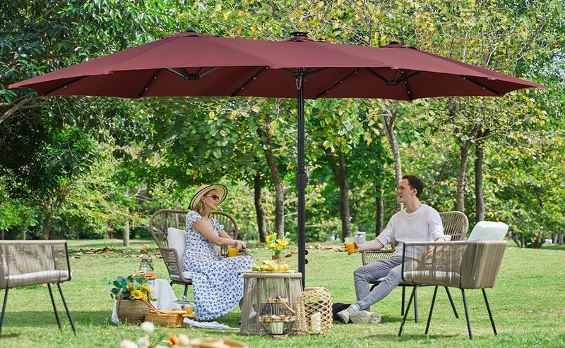 Quick Overview:Featuring excellent resistance to UV, wear and weatherhigh colorfastness, a twin-size canopy as well as a user-friendly control system, and 36 LED lights, this extra-large patio parasol is indispensable for a big family toenjoy happy summer days! This extra-large patio parasolset comes with the parasol, base, base cover, 2sandbags and tools required for assembly. You have noneed to extra prepare any accessories. The 36 LED lightsare controlled by a handy switch on the pole, adding aromantic vibe to your space at night. The opening andclosing of the canopy are controlled by the hand crankthat you can get the parasol prepared effortlesslywithout others' help. The design of the ventilation systemallows as much as possible air to flow through,preventing the parasol to be blown down by the wind,meanwhile, effectively keeping the air below the canopycool on scorch summer days.Details:1.36 Solar-Powered LED Lights: This patio parasolembraces 36 solar-powered LED lights along the ribsproviding ambient lighting and creating a romanticatmosphere.Powered by a top solar panel and an AArechargeable battery, the lights offer up to 8 hours ofillumination after a full charge2.Operating Hand Crank: This patio canopy features aconvenient hand crank for easy opening and closing.With a simple turn, you can effortlessly set up or retractthis 15ft parasol, making it friendly and suitable for avariety of applications and outdoor settings3.Powder-Coated Surface: The metal frame of thisoutdoor patio parasol features a powder-coated finishproviding enhanced protection against weathering. Thisdurable coating ensures the iron supports remain inexcellent condition, making the parasol a long-lastingaddition to your outdoor space4.Thick 180g Polyester: This patio canopy is crafted fromthick 180g polyester, offering exceptional wear and tearresistance, weather durability, overall stability, and highcolor fastness. Most importantly, it provides effectivephysical sunscreen,making it a premium choice forreliable sun protection5.Generous Shade: Featuring a15ft regular dodecagon-shaped canopy, this twin patio parasol is designed toprovide ample shade for large outdoor gatherings. lt'sspacious enough to accommodate your family andfriends, allowing everyone to relax and enjoy quality timein the yard, garden, park, patio, or at the beach6. Triple Vented Top: This patio umbrella features anextended canopy with three ventilation openingsallowing for balanced air pressure both inside andoutside the canopy, reducing wind resistance andkeeping the parasol stable, even on breezy days7. Heavy-Duty lron: This patio parasol is supported by 12robust, heavy-duty main ribs and a durable diametercenter pole. Built to withstand the elements, this strongiron frame ensures long-lasting stability and reliablesupport for years of use8.Base Included: This XL patio parasol set comescomplete with the parasol, a sturdy base, a protectivebase cover, sandbags, and all the necessary tools forassembly. No additional accessories are required,providing everything you need for easy setup andimmediate use9.Sandbags, Extra Stability: This twin patio parasol setcomes with 2 sandbags to enhance stability. You can fillthe sandbags with the appropriate amount of sand basedon your local weather conditions, ensuring the parasolstays secure and steady, even on breezy days -