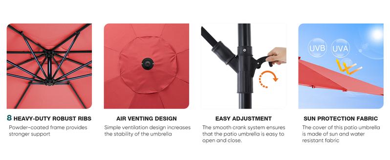 - Easy Tilt and Lift System: The user-friendly crank。handle allows smooth operation for opening and closingthe patio umbrella. Easily adjust the angle from 0-35degrees to suit your preferences.