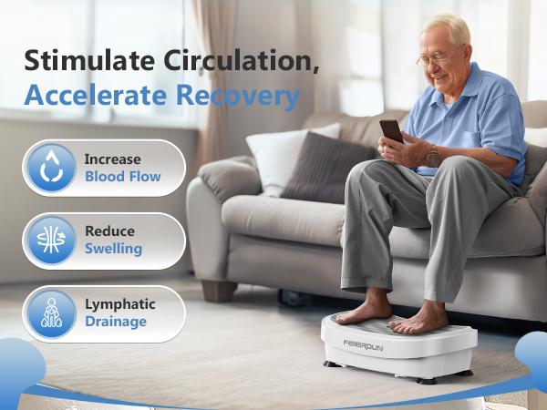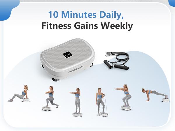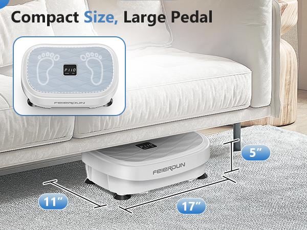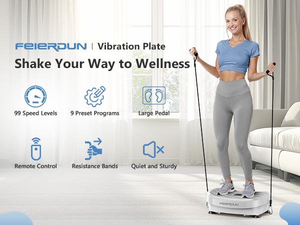 【Exercise at any time】-Compact size and constantmaximum weight capacity! Measuring only 17" x 11"x 5"it can be used anywhere,space-saving, easy to carry andstore, and you can work out anytime, anywhere, evenwhen you are on vacation; the novel and stylish newdesign allows you to enjoy a healthy experience as soonas you step on the newly upgraded vibration platform【Exercise and muscle repair】 -Gentle vibration awakensthe muscles throughout the body, helping to reducelactic acid buildup and restore muscle strength,promoting blood flow to the muscles, acceleratingmetabolism and lymphatic drainage. This process notonly helps relieve chronic pain, enhance cell regenerationand repair old injuries, but also improves the body'srange of motion【QUIET & EFFICIENT】-With newly upgradedergonomically designed casing to ensure more stabilityand durability than ever before; featuring non-slip coateddesign with 4 sturdy rubberized non-slip suction cups onthe bottom of the machine to ensure more safety andstability during exercise; Noise-reducing designminimizes vibration noise even at the highest intensity【Convenient Operation】-Select from 99 speed levelsand 9 preset programs to customize your workout; user-friendly remote control allows you to adjust vibrationspeeds and modes at the touch of a button; LED displayshows gears and speeds for an at-a-glance view of yourworkout; and comes with resistance bands for more waysto move【Service Assurance】 -We promise to provide 1yearsservice for FElERDUN vibration plate; lf there is anyproblem with the product, We accept unconditionally no-cost returns or exchanges,Please don't hesitate tocontact us if you need help, and we will reply to yourmessage within 24hours -