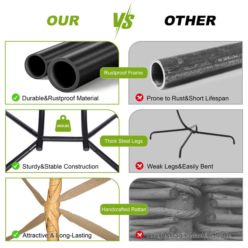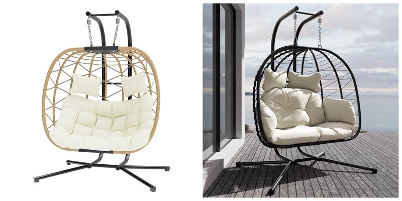 【Unmatched Durability】700lb Weight Capacity -Heavy-duty steel chains &reinforced frame safely support multiple usersAll-Weather Construction -Premium PE rattan & rust-resistant metal withstand sun, rain and wind【Premium Comfort】Ergonomic Cocoon Design -Body-contouring curvesrelieve pressure points4" Thick Cushions -High-density foam providescloud-like support【Smart Space-Saving Design】Foldable Metal Frame -Collapses easily for compactstorage (saves 60% space)Quick Assembly -No tools required for setup【Stylish Versatility】Modern Handwoven Look-Elevates patios, gardensor living roomsWeatherproof Cushions -Stain-resistant & quick-drying fabric【Easy Maintenance】Wipe-Clean Surface - PE rattan requires minimal care