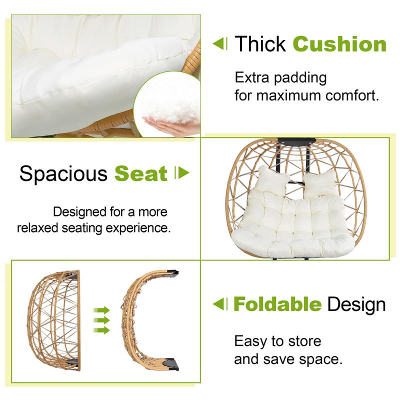RIWENGO Double Hanging Egg Chair with Weather-Resistant Cushion, 700lbs Capacity - Foldable Patio Swing Chair with Handwoven PE Wicker & Rust-Proof Frame, for Garden, Porch, Backyard