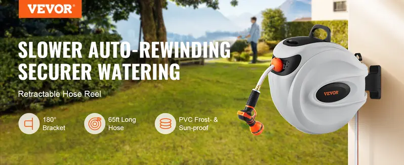 Auto Rewind System: No matter how far the hose isstretched, it can be retracted safely and slowly after aslight pull. Our slow-retractable hose reel is labor-savingand can avoid damage or injury caused by too fastretraction. Bid farewell to messy hoses and never spend
